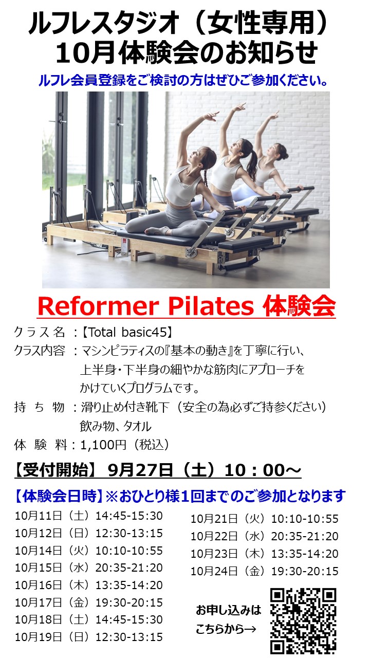 【スタジオCの運用変更について】10月よりスタジオCはルフレスタジオ(女性専用)に変更となります。詳細は下記よりご覧ください。→https://megalos.co.jp/mitaka/wp-content/uploads/sites/19/2025/09/media25095103346.pdf新規導入のマシンピラティス体験会(女性専用)に関しては、下記ご覧ください。→https://megalos.co.jp/mitaka/wp-content/uploads/sites/19/2025/10/media251012021318.jpg